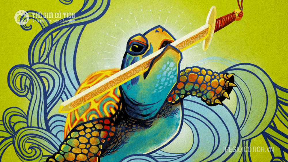 miệng rùa vàng. Rùa vàng ngậm lấy gươm, lặn xuống hồ biến mất.